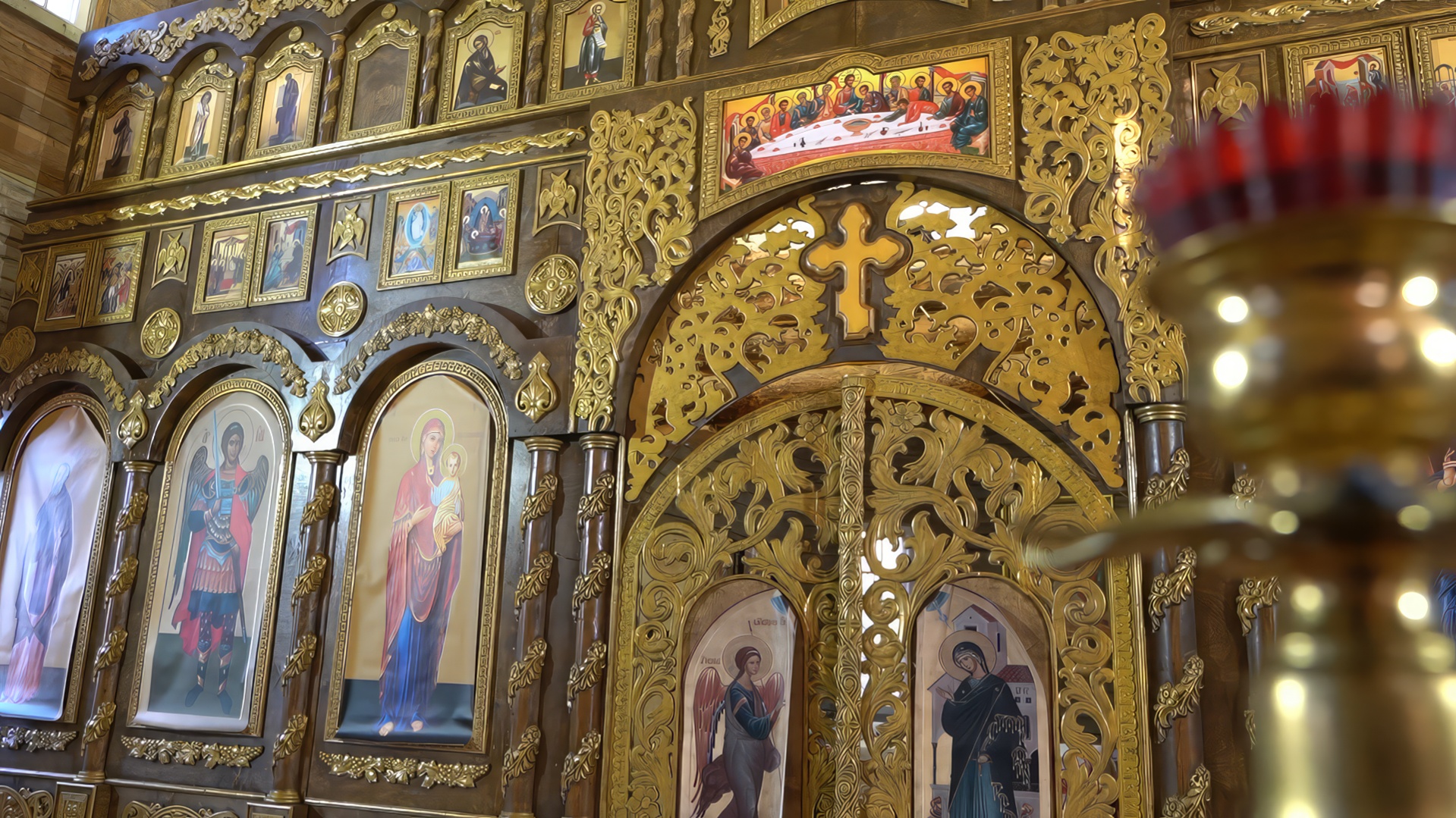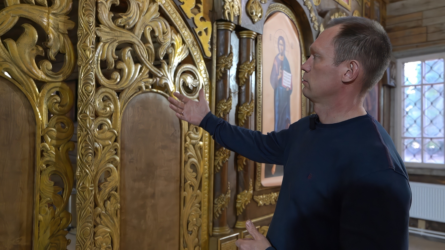 Особое место в конструкции занимают «царские врата», ведущие в алтарную часть храма. По словам мастера, этот элемент — самый ответственный во всём иконостасе. Врата почти полностью состоят из резных деталей, покрытых золотой патиной. При этом конструкция остаётся достаточно лёгкой, несмотря на внушительные размеры. Мастеру пришлось искать баланс между декоративностью и практичностью: резьба не должна утяжелять створки, чтобы их было удобно открывать и закрывать во время богослужений.