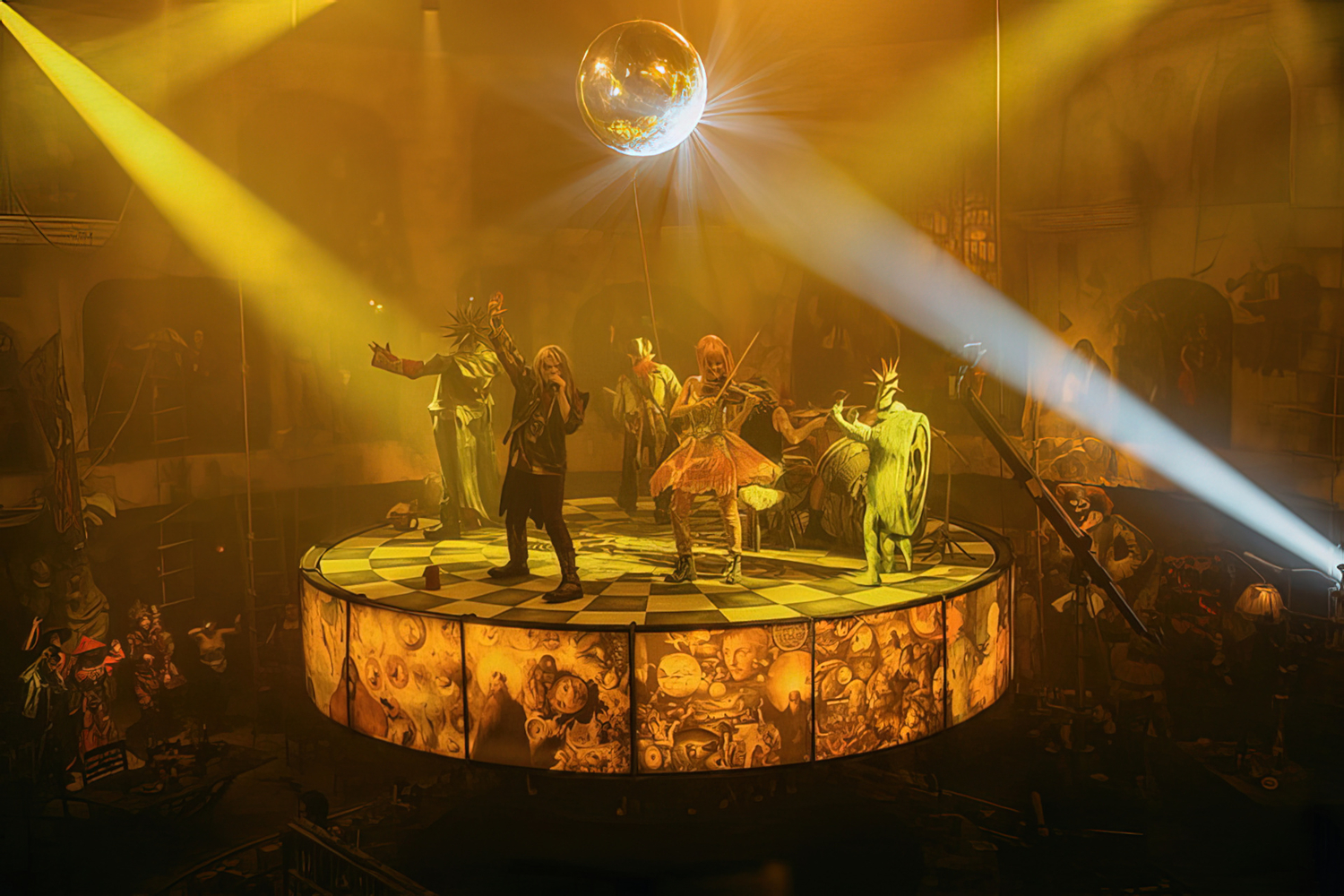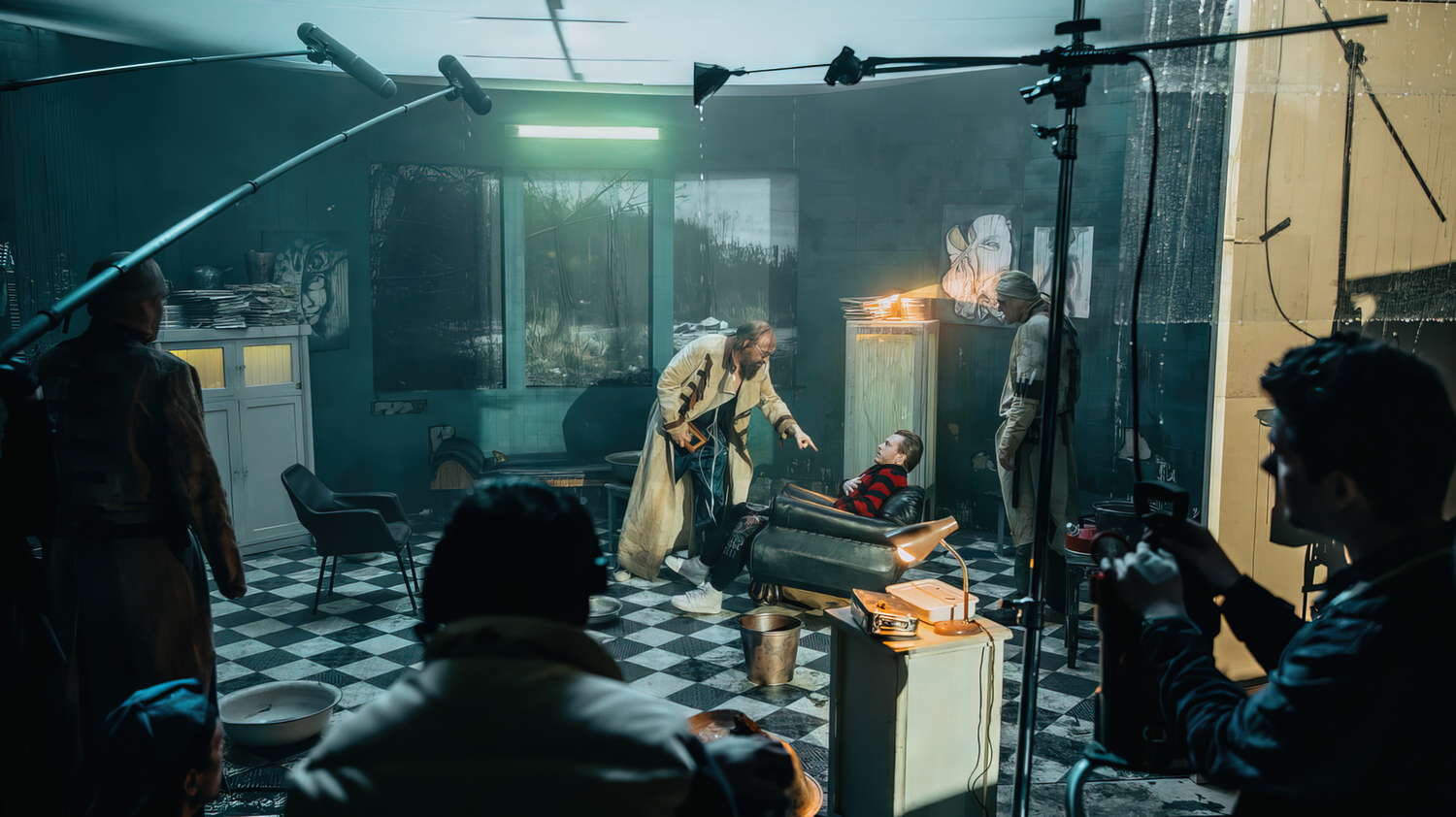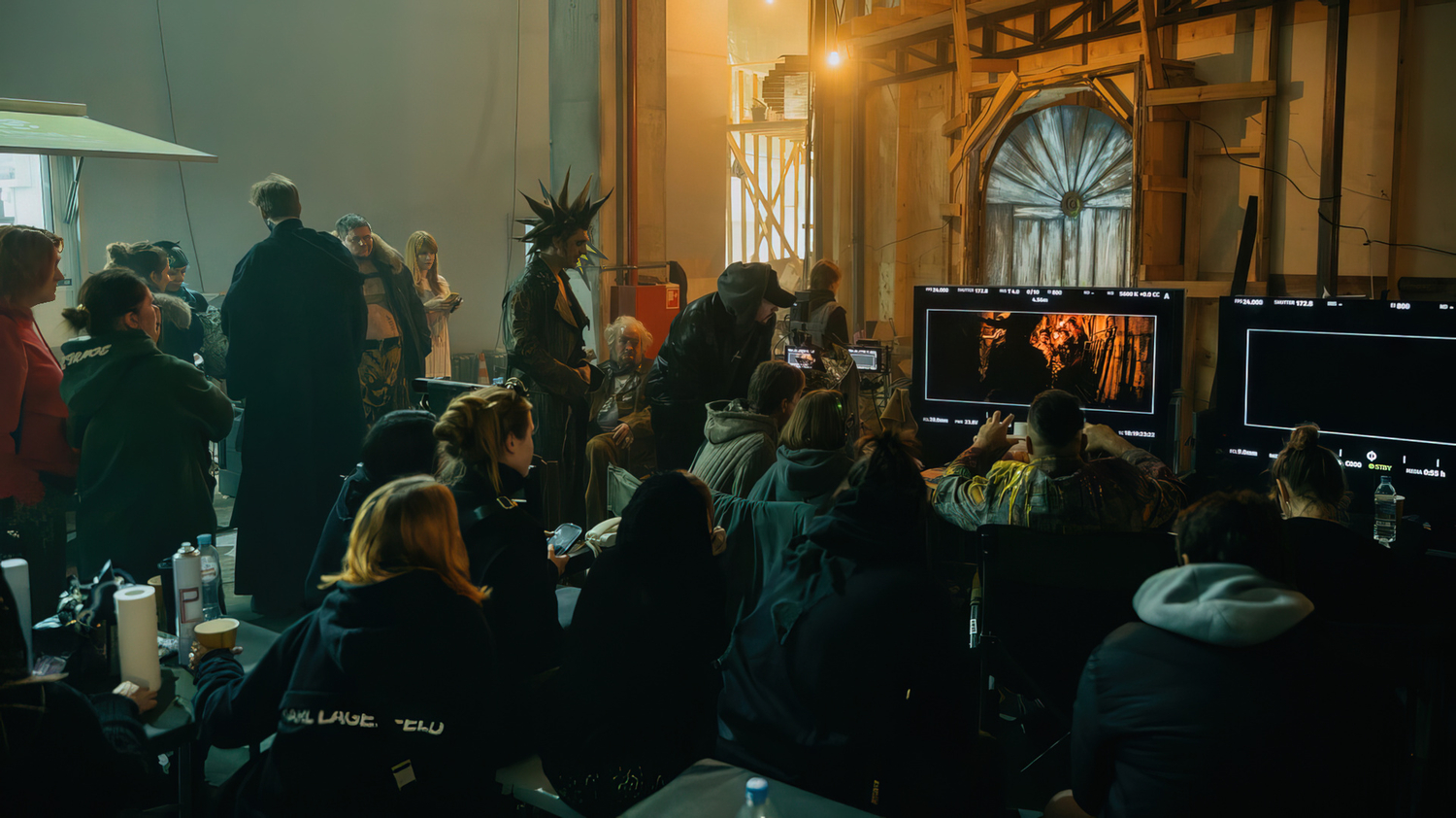 Параллельно с натурными съёмками велось масштабное строительство декораций. Одной из крупнейших стала трёхэтажная конструкция сказочного кабака диаметром около 30 метров. Её возводили более двух месяцев. В сценах, снятых в этом пространстве, участвовали свыше 200 актёров массовки, перевоплощённых в монахинь, шляпников, горбунов и клоунесс.