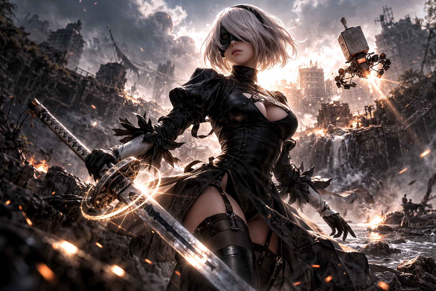 Самый востребованный персонаж для косплея — 2B. Её образ лаконичен и узнаваем: строгое чёрное платье с высоким воротником, элегантное каре, повязка на глазах и массивный меч. Благодаря чёткой стилистике и относительно небольшому числу деталей этот костюм стал одним из самых популярных на косплей‑мероприятиях. Косплееры уделяют особое внимание точности: воспроизводят текстуру ткани, форму аксессуаров и даже характерные позы персонажа.